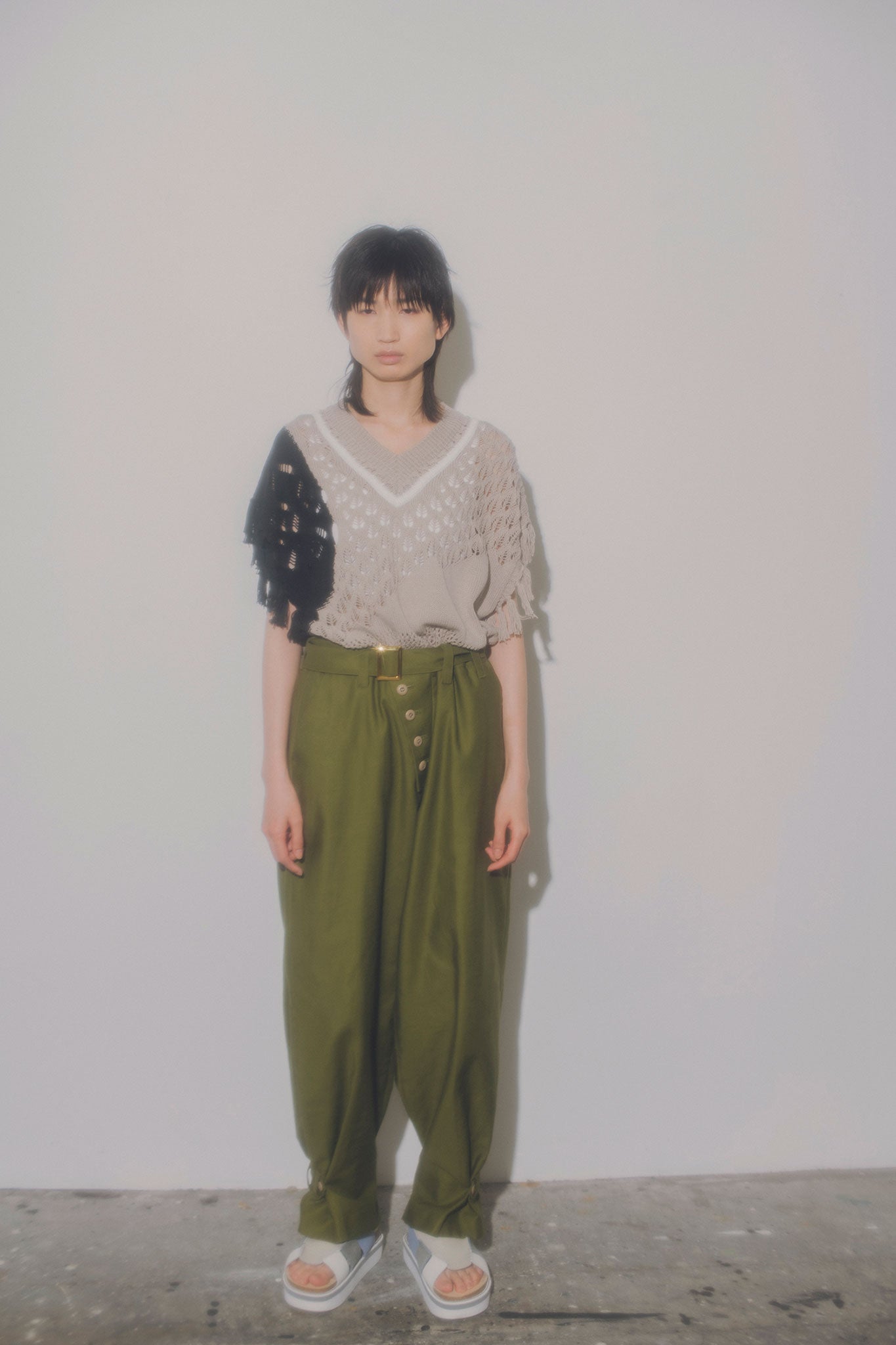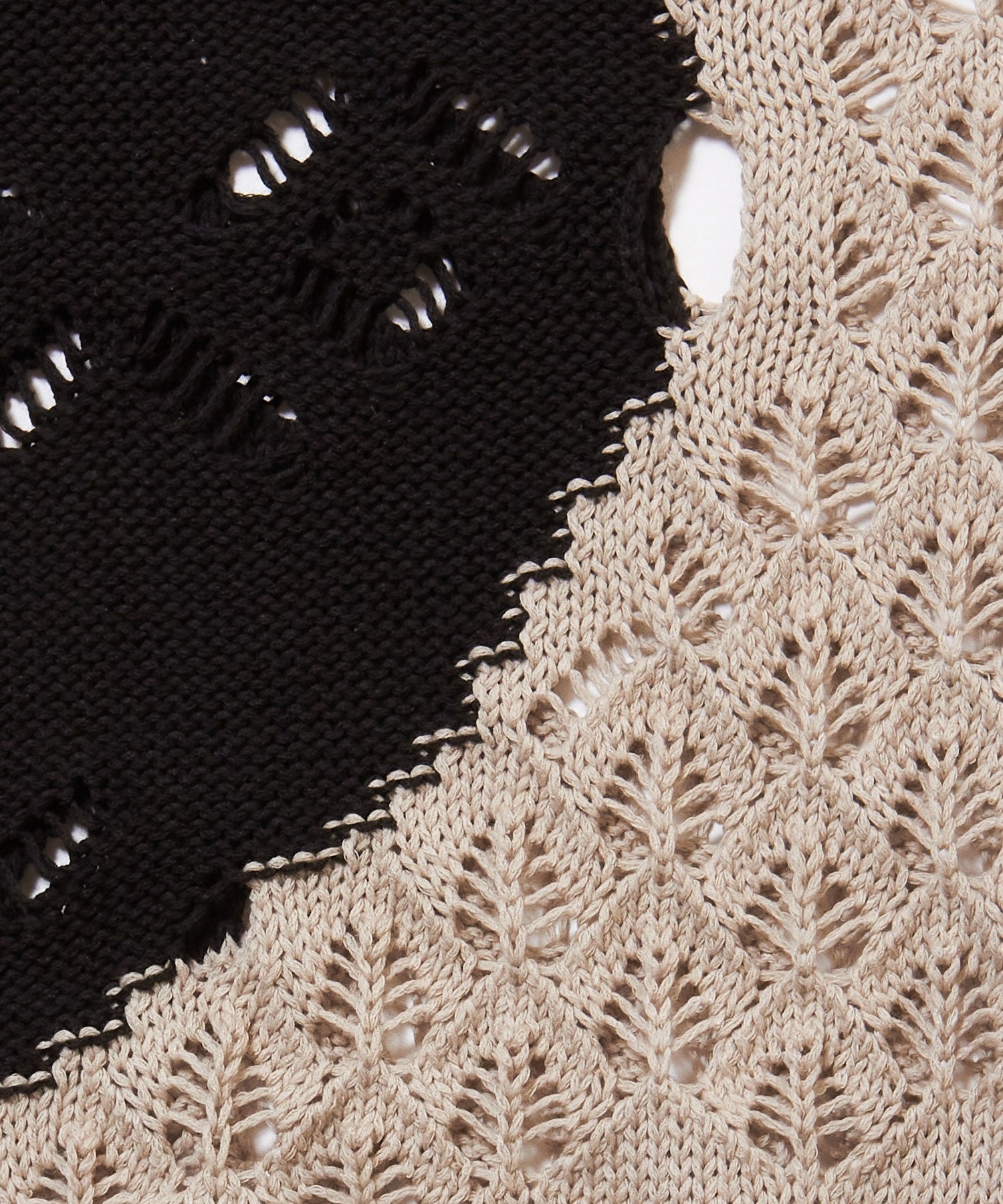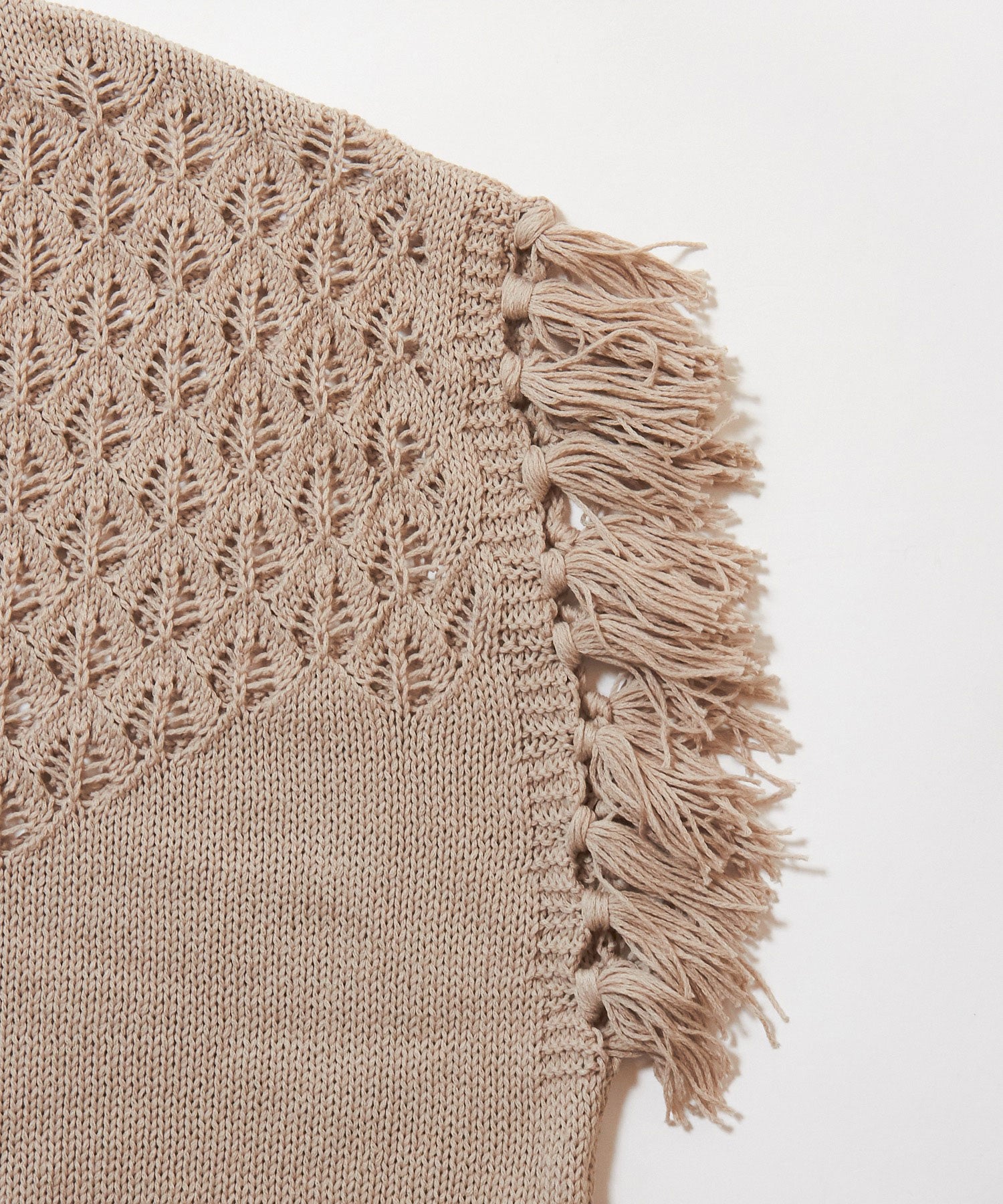 A knit vest designed with several types of delicate knitted fabrics. The switching part on the right and the transparency express the theme of shadow. It can be worn in a variety of ways, such as layered over a shirt or T-shirt. The highlight is the same thread fringe on the sides and hem.