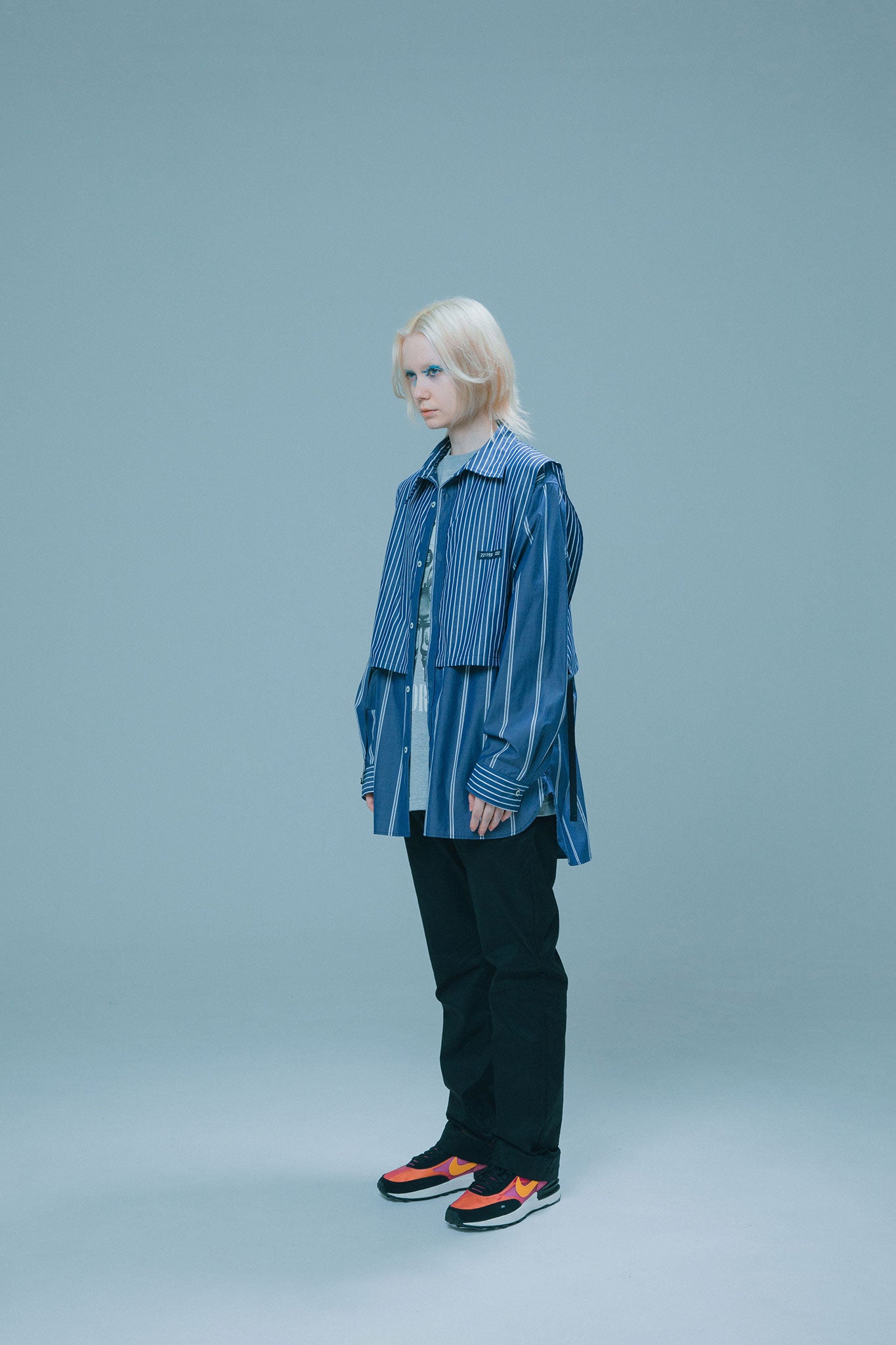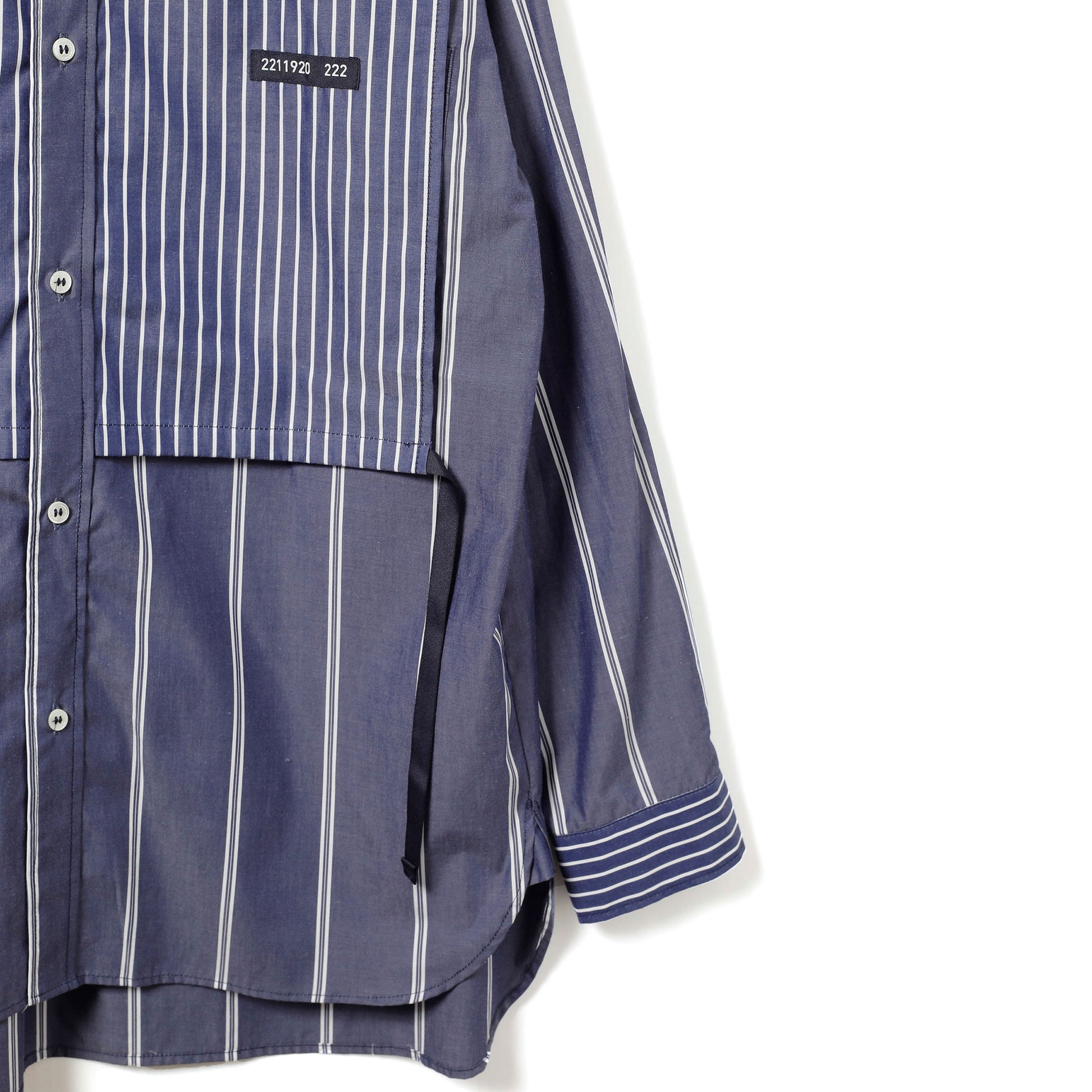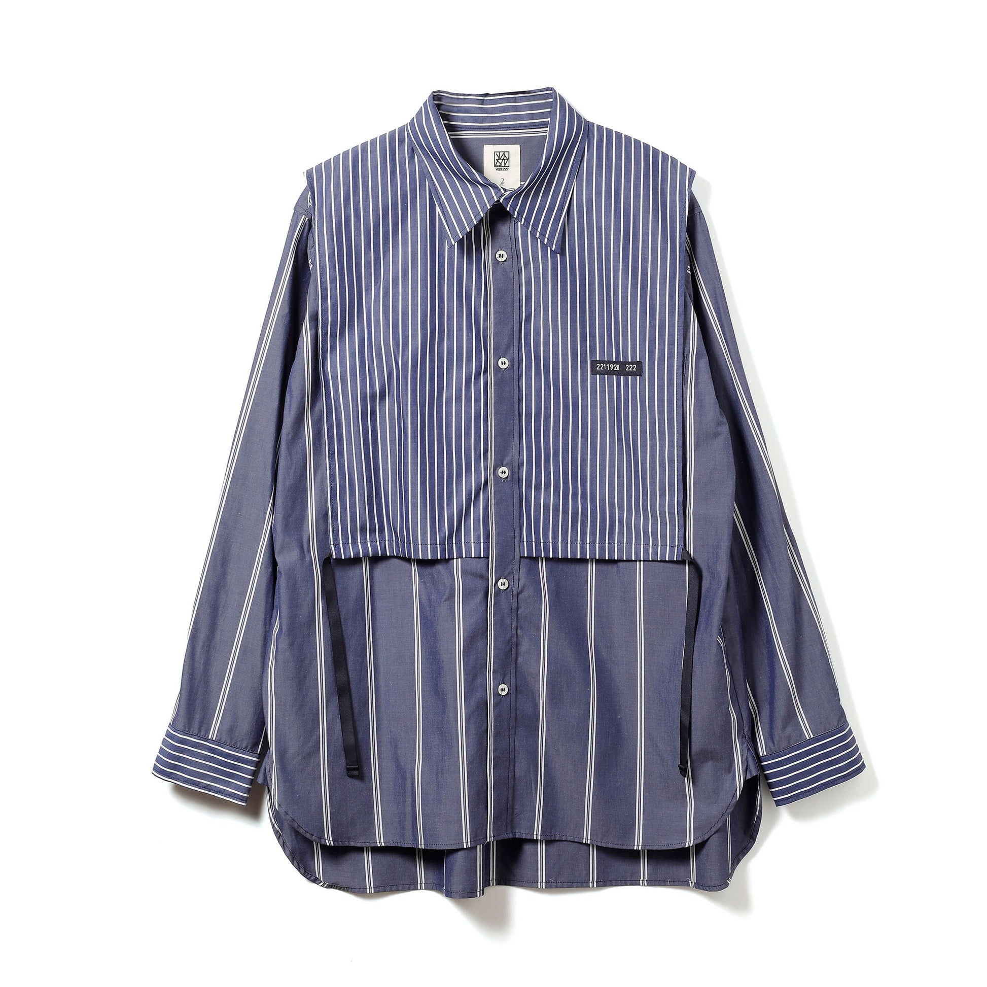 A shirt with a layered design made of different striped fabrics with high density and a moderate sheen. You can also change the layered part by tightening it with tape cord and tying it on the side.