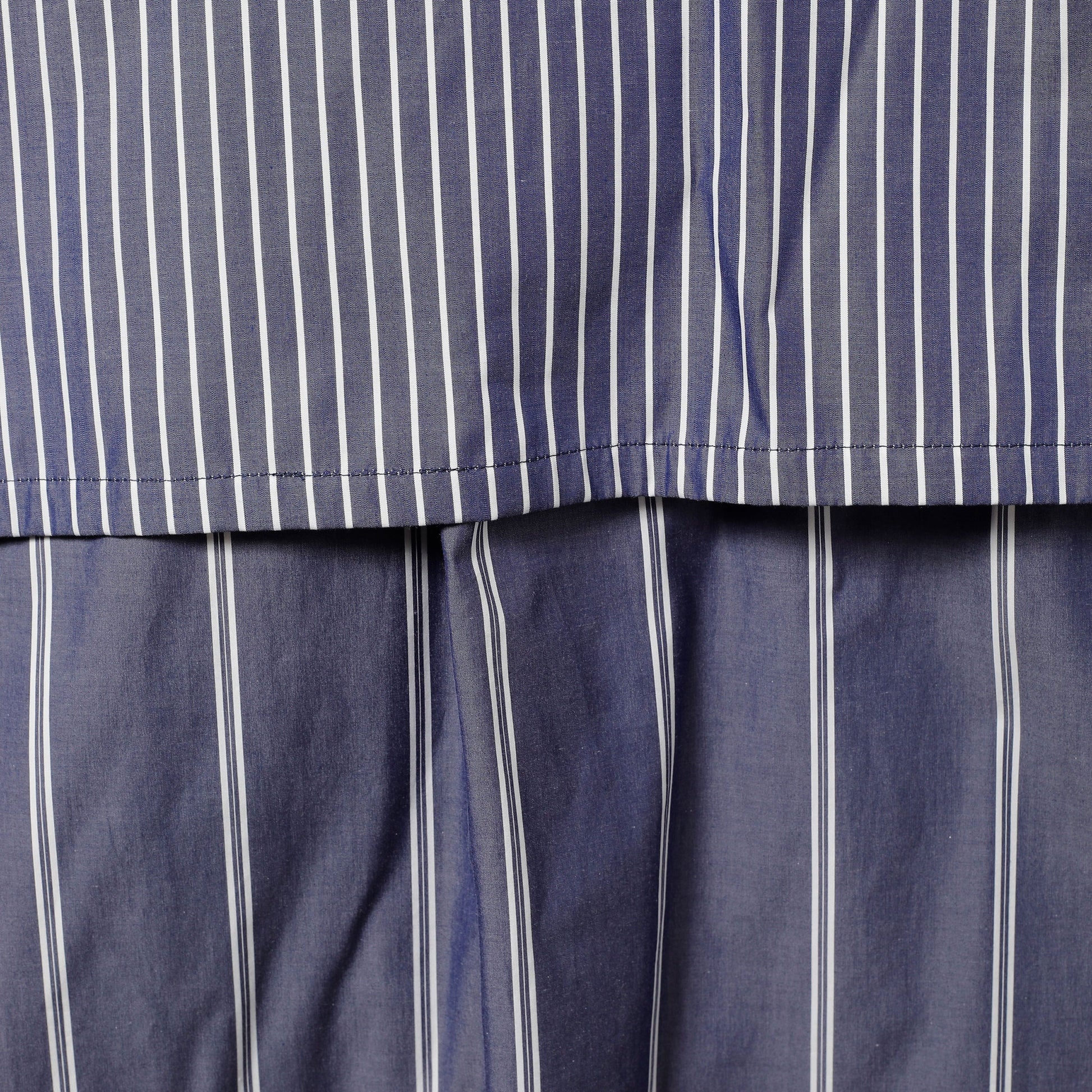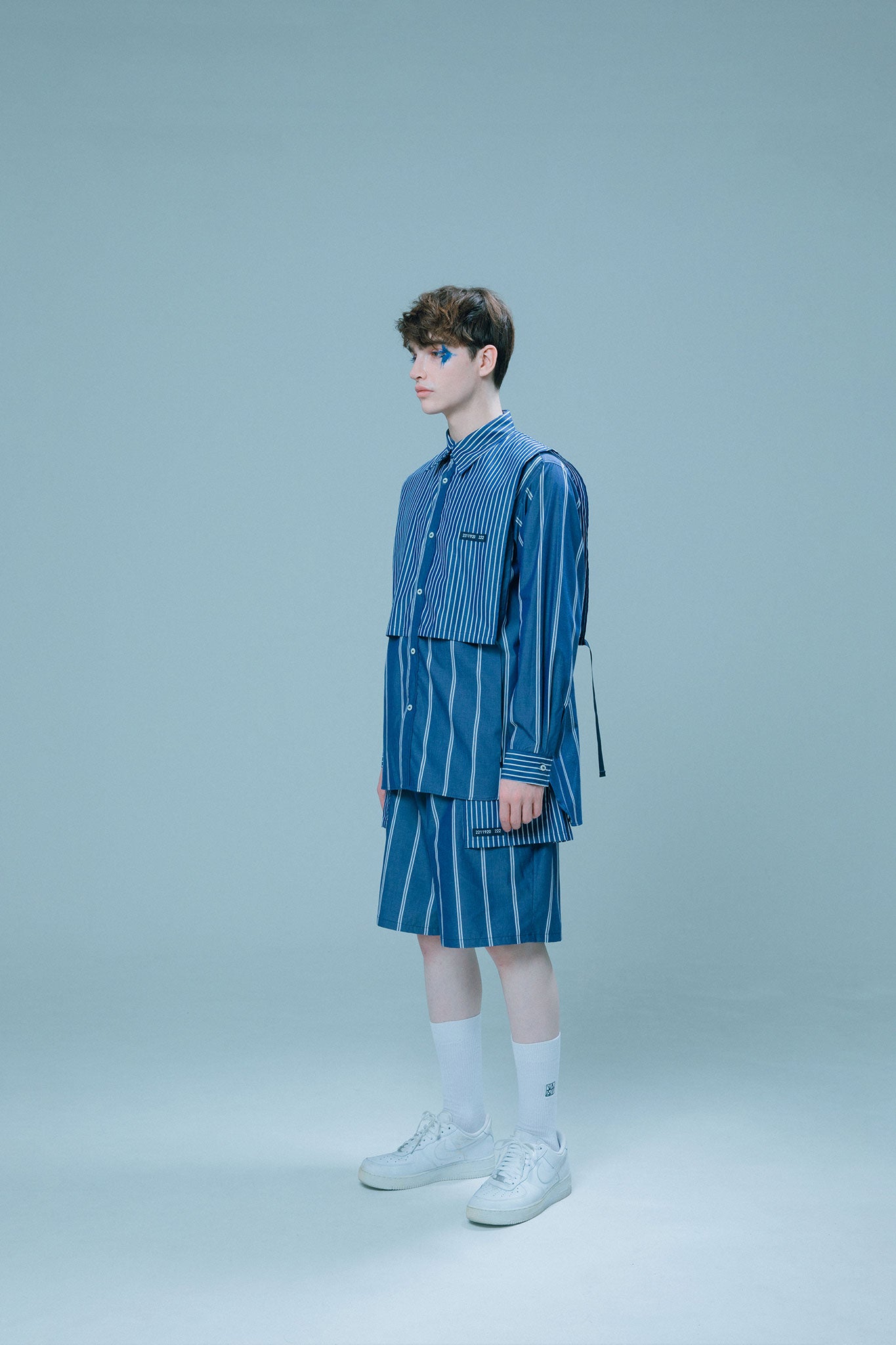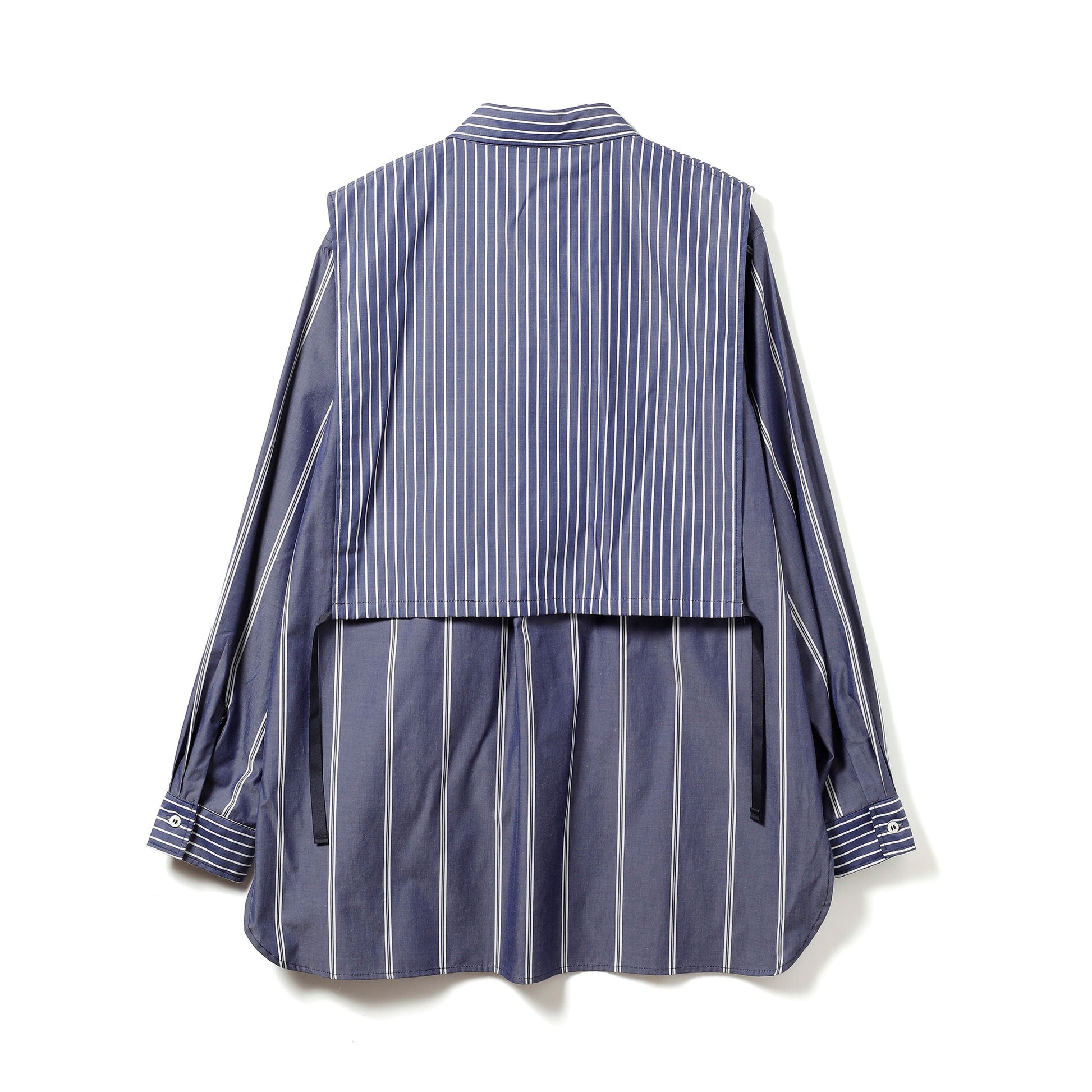 A shirt with a layered design made of different striped fabrics with high density and a moderate sheen. You can also change the layered part by tightening it with tape cord and tying it on the side.