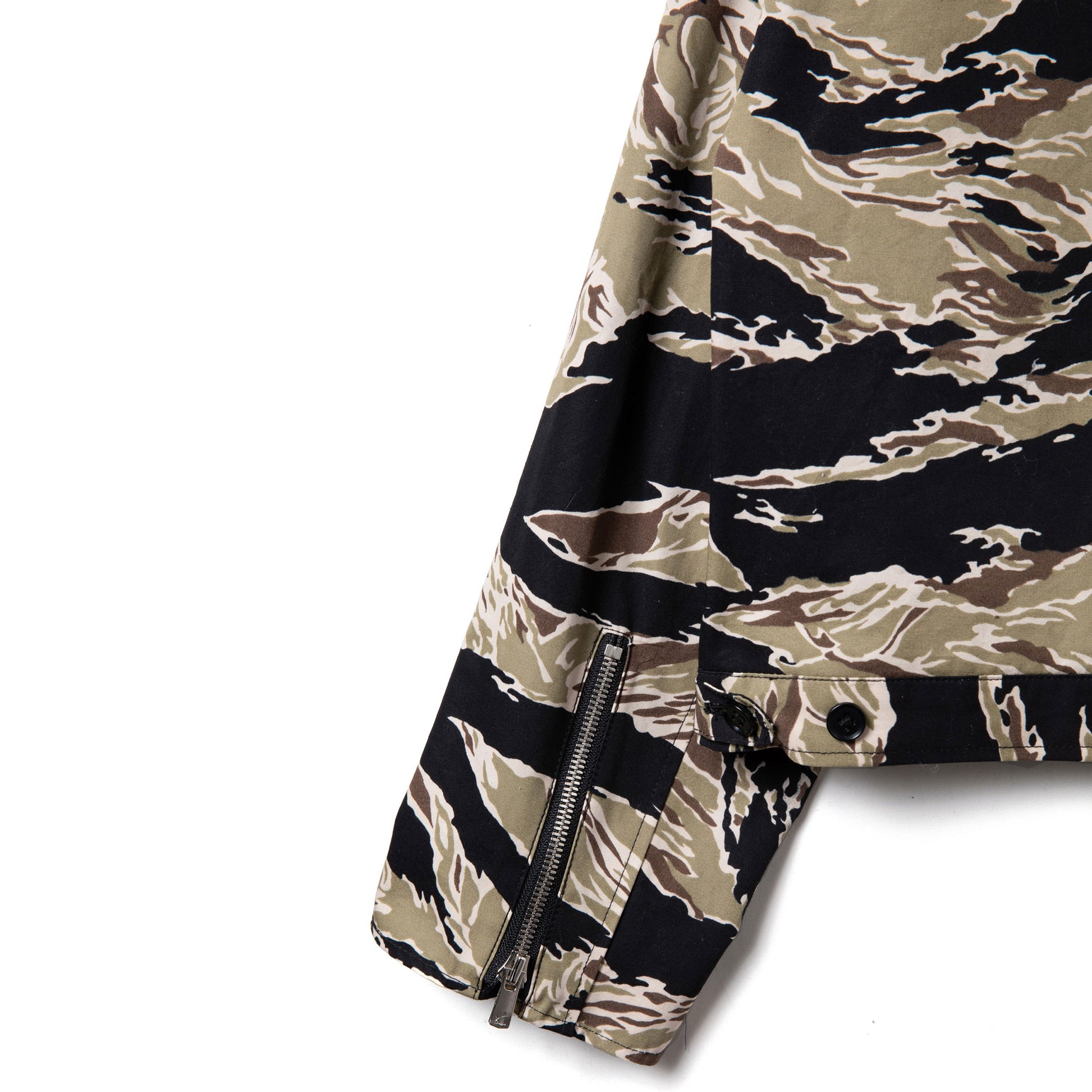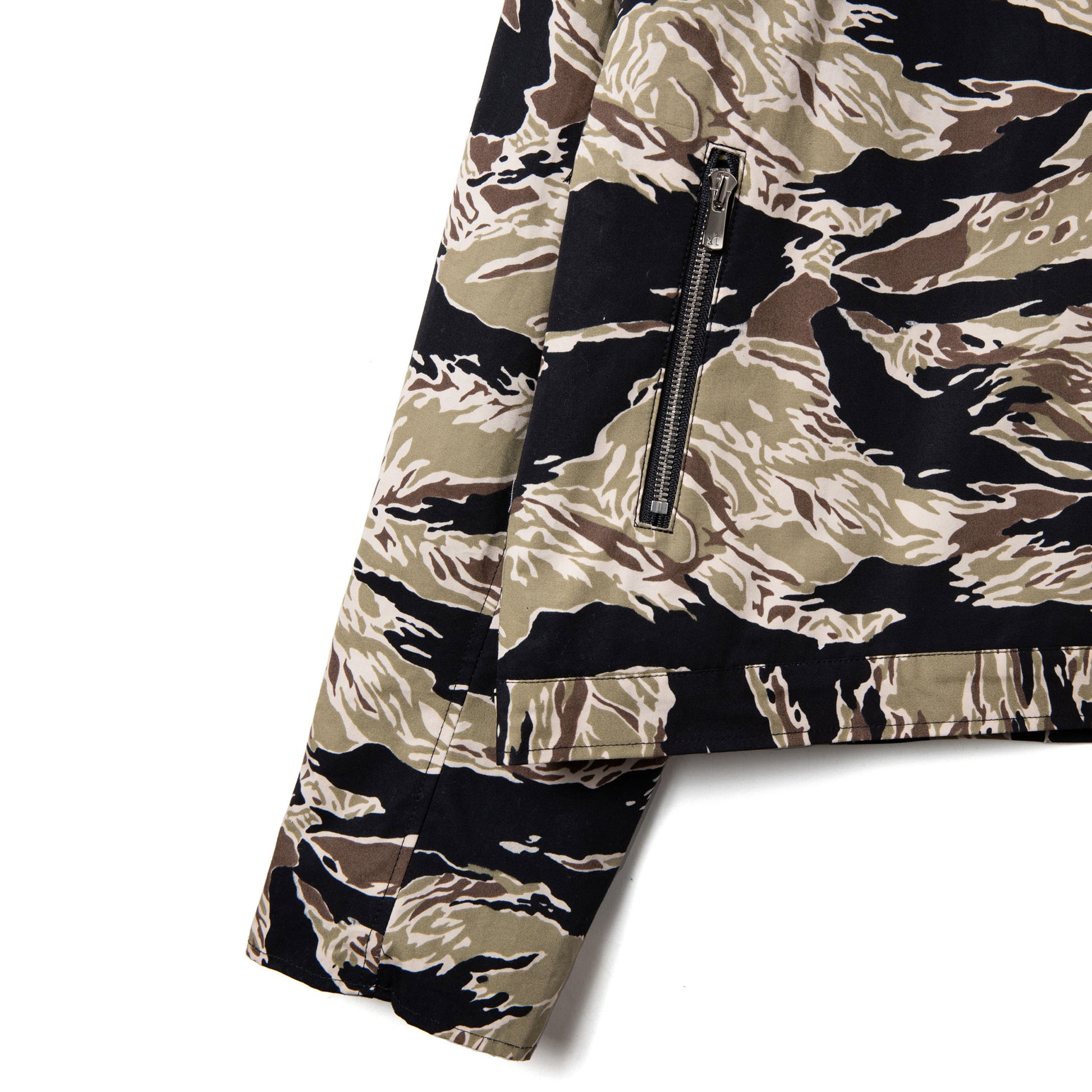 使用兩種類型的迷彩布料:雪迷彩和老虎迷彩。拉鍊外套,輪廓優美,長度略短。拉鍊採用Excela。